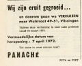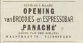 Onbekend In een advertentie in de krant van 14 oktober 1999 meldt een onbekende nieuwe eigenaar wegens overname van lunchcafé Panaché op zoek te zijn naar een serveerster en een interieurverzorgster. |